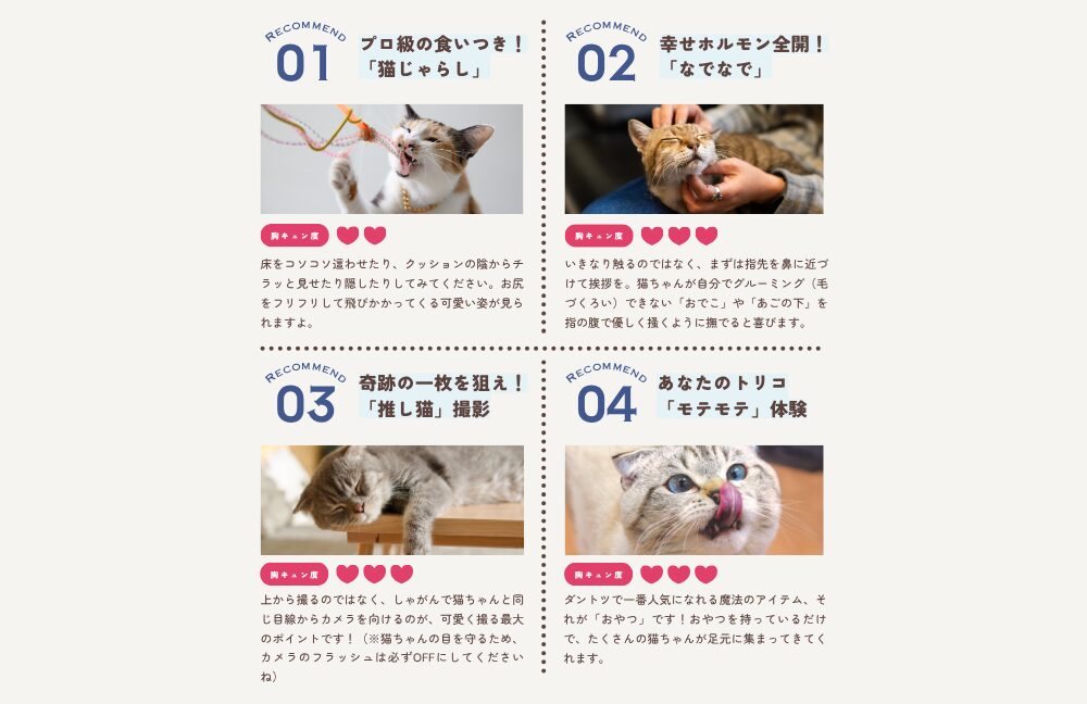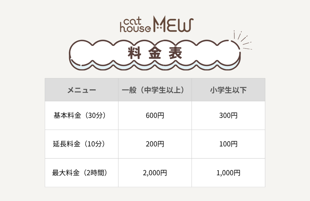 小学生以下のお子様は30分300円と、ご家族みんなで気軽に楽しみやすい料金システムです。猫ちゃんにダントツでモテモテになれる魔法のおやつもご用意しています!